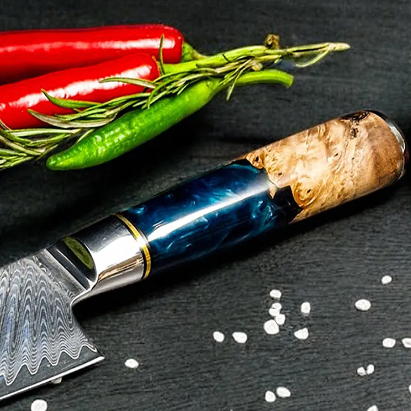 Die Damaszener Universalklinge ist nicht nur ein Küchenwerkzeug, sondern auch ein Kunstwerk. Ihre scharfe Klinge ist aus hochwertigem Damascus VG-10 Stahl gefertigt und verfügt über 67 Lagen für aussergewöhnliche Härte und Schnitthaltigkeit. Der präzise V-förmige Schliff mit einem Winkel von 8-12° pro Seite garantiert erstklassige Schärfe.