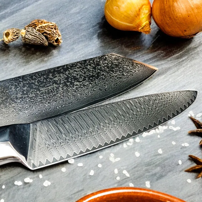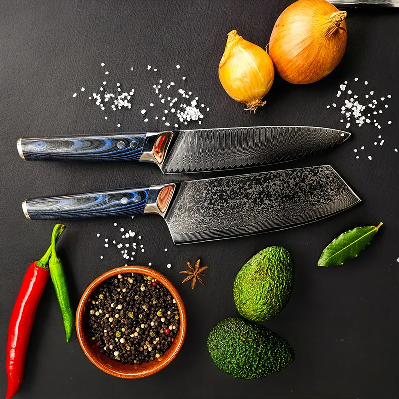Das Set enthält das Damascus Cleaver Knife mit einer Gesamtlänge von 33 cm, einer Klingenlänge von 19 cm und einer Stärke von 2.2 mm, sowie das Damascus Steel Chef Knife mit einer Gesamtlänge von 33 cm, einer Klingenlänge von 20 cm und einer Stärke von 2.2 mm. Beide Messer werden aus handgefertigtem japanischem 67-Lagen VG-10 Damaststahl gefertigt, während der Griff aus hochwertigem G10 Material besteht.